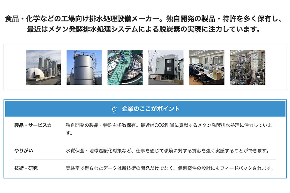 回転児雷也・UASB-TLPといった多くの自社技術を有しており、エンドユーザーのみならずエンジニアリングメーカーにもその技術を供与しています。革新的な排水処理技術により多くの工場を陰から支えており、やりがいのある仕事と考えています。